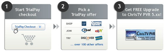 Because of our partnership with TrialPay, you can now get ChrisTV PVR Lifetime Upgrade, a $25.95 value, for free simply by trying or buying a product from one of our trusted partners.